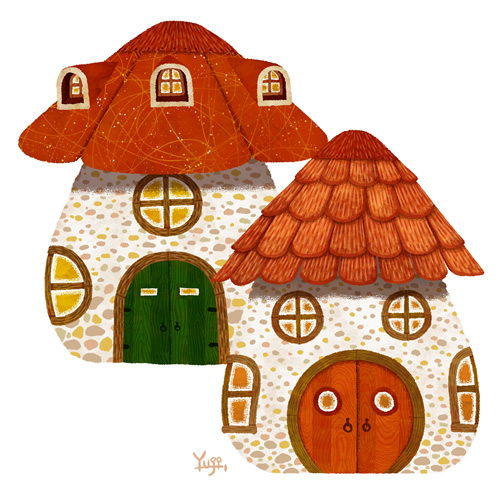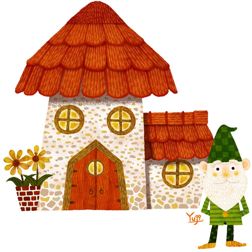 ノームの村の建物は、主に2種類の様式で作られています。いずれも、“幸運のキノコ”を模しています。居住者が住む建物(母屋)は、キノコを模しているので、角の無い作りになっており、床面は円形である事が特徴です。また、用途や居住者の技能によっては、母屋とその他の場所(例えば、倉庫であったり、栽培スペースであったり、作業場であったり。)とを分けているケースがあります。その場合は、母屋に別棟が接続される形で作られます。この別棟の形は様々で、キノコを模していないケースもあります。