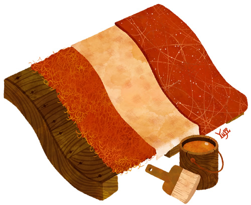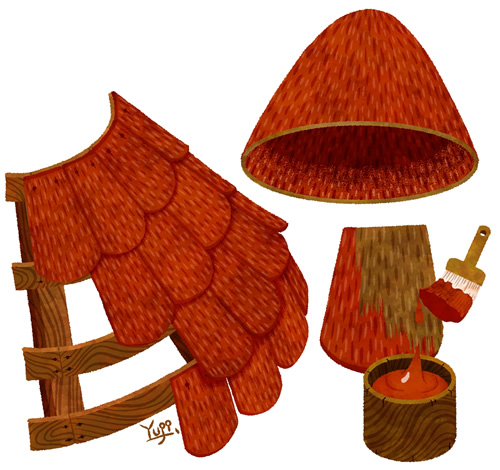 鱗板は、薄く剥いだ世界樹の樹皮を重ねて接着し、鱗の形にカットしたもので、塗料を塗って保護しています。この塗料は、オオモンサンセットアゲハの蛹の殻を溶かしたものに、ハイアーベリーの皮が原料の着色剤を混ぜたもので、固まると防菌・防水効果に優れた保護剤になり、屋根を守ってくれます。