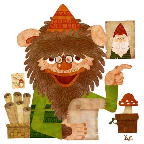 ところで、ピグミー・ピグミー族の長老の中には、ノームたちの文化に興味津々な長老がいます。その長老は、研究と観察のために、わざわざノームの村に引っ越したほど。この長老のおかげで、ノームはピグミー・ピグミー族の言葉を、ピグミー・ピグミー族はノームの言葉をペラペラにしゃべれるくらい仲良くなったのです。みんなは、彼を親しみを込めて『教授(きょうじゅ)』と呼んでいます。そして、『教授(きょうじゅ)』は、今日もお互いの親睦と理解を深めるために、あっちのノームの村に…、こっちのトロールの村に…、と走り回るのです。かなりの高齢ですが、元気ですね。