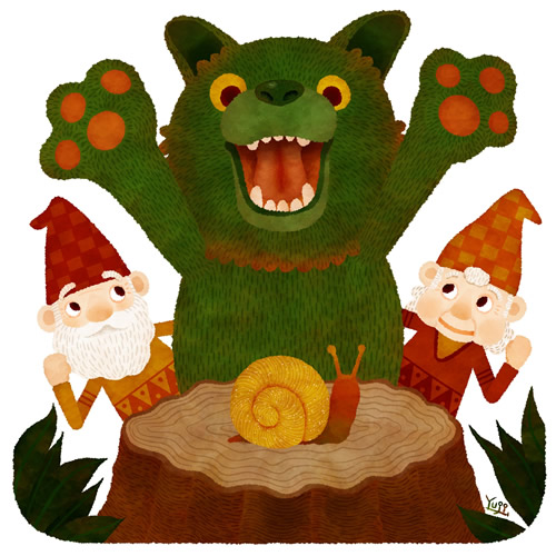 ガーダーウルフは、ノームの森が『ノームの森』と呼ばれるずっと以前から、森を守っているオオカミです。体の色が特徴的な緑色をしていて、日に照らされると毛先の方が、燃えるようなオレンジ色になるのが神秘的。とても大きな体をしていて、人間たちの話では「牛と同じくらいだ」と言われていましたが、少し大げさかもしれませんね。昔は、今よりもずっと数が多く、うっかり森に入った人間とバッタリ出くわす、なんてこともあったかもしれません。その時の恐怖心から、大げさに話が伝わったのかもしれませんね。