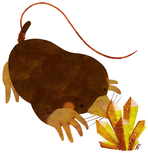 パッと見は、どこにでもいるモグラです。けれども、非常に頭が良く、人懐っこい性格をしています。このモグラの最も特筆すべき点は、嗅覚が普通のモグラの何倍も優れており、更にその嗅覚は、土中の「オリハルコン」を見つけることができる点にあります。一説によると、ハルコニアモグラがオリハルコンを見つけることができるのは「嗅覚の他に、第6感の様なものを利用している」とも言われていますが、この点に関しては定かではありません。いずれにせよ、オリハルコンはノームの森の住人の生活にとって、非常に重要な役割を持っているため、このハルコニアモグラは、ノーム達にとって、非常に頼りになる存在なのです。