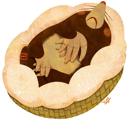 そんなハルコニアモグラですが、大人になってからは、基本的には自由を尊重した放し飼いです。しかし、子どもの頃から生活してきたパートナーの家は、とても居心地が良いのか、ちょくちょくパートナーの家に戻ってきます。そして、野生の生きものであることを忘れてしまったかの様に無防備にお腹を見せて眠りこけることもしばしば。特に、フカフカのベッドがお気に入りなのです。パートナーは「自然の中で生きていけるのか?」と心配しています。それでも、やる時はしっかりと役割を果たしてくれるので、大目にみながらオリハルコン採掘に励んでいるのです。